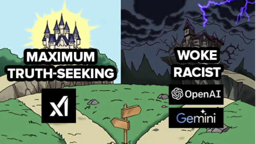 此前一天,马斯克还在X上发布了一张内涵图,嘲讽谷歌Gemini和OpenAI所代表的“觉醒种族主义”。