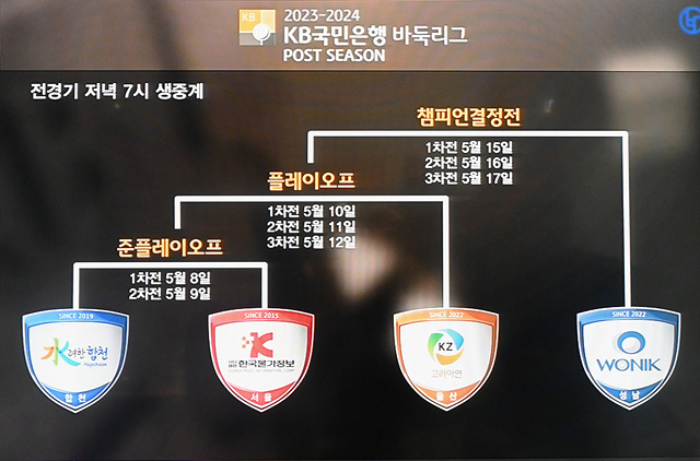 也就是说首轮季后赛,排名常规赛第4的陕川郡队必须连赢两场,方可获得挑战常规赛第2名蔚山队的机会;而常规赛第3的韩国物价信息队只需赢一场就能晋级。5月10日至12日的半决赛和15日至17日的决赛,均采用三场两胜制,决出最终优胜者。