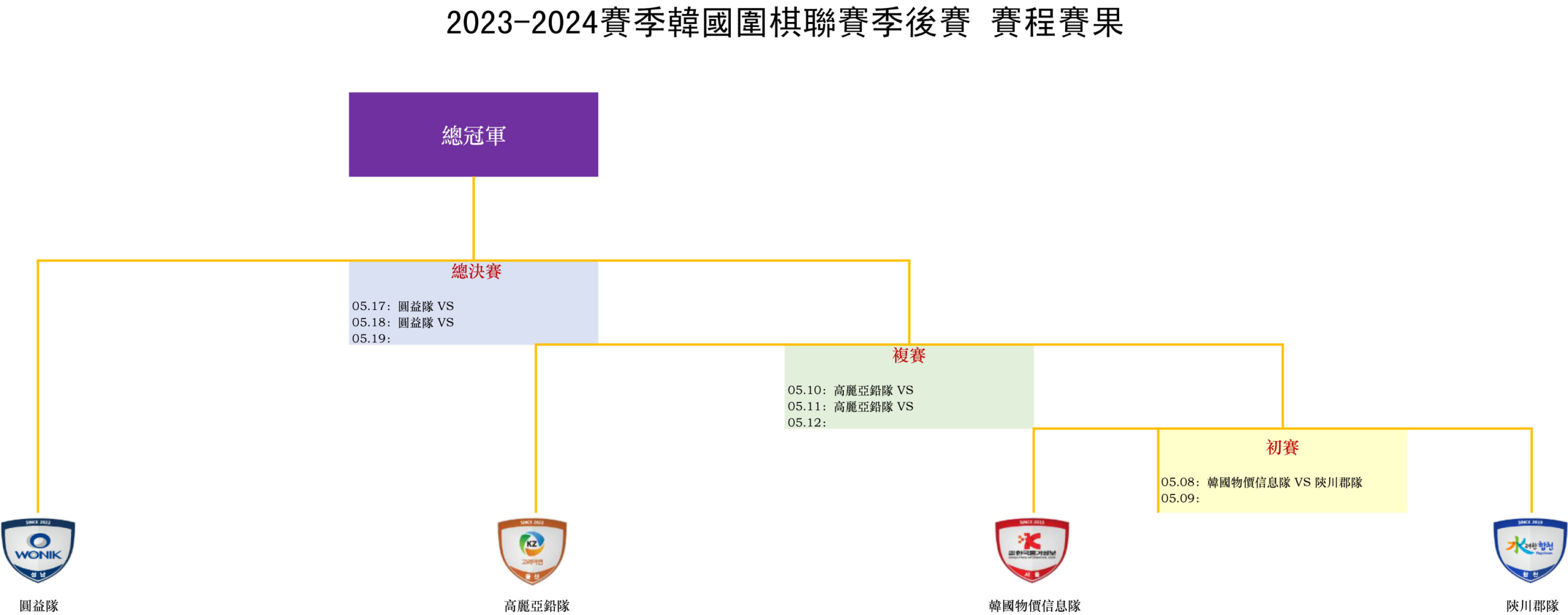5月10日,韩国物价信息队和陕川郡队的胜者将与常规赛第二名蔚山队交手,采取三场两胜制,胜出者将于5月17日与常规赛冠军圆益队争夺本赛季联赛的总冠军。