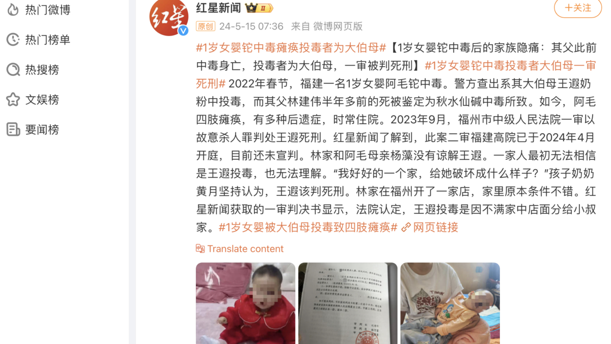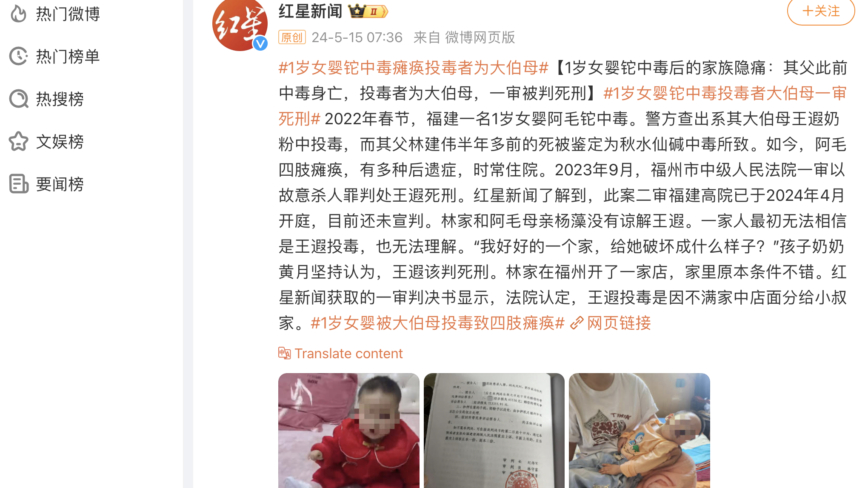 【新!唐!人:北京时间2024年05月15日讯】2022年中国新年期间,福建一名年仅1岁的女婴阿毛铊中毒,至今四肢瘫痪,并伴有多种后遗症。警方查出是她的大伯母王遐在奶粉中投毒。而她的父亲林建伟半年多前的死因也是“中毒”。