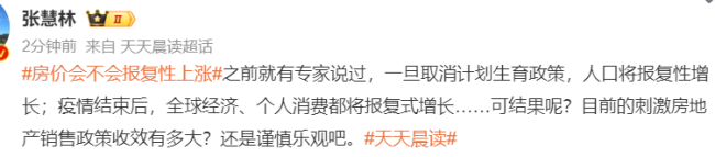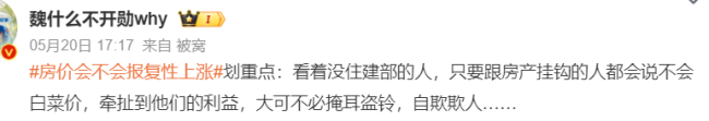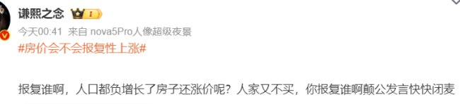 一时间,中国网民都炸了锅。微博上,围绕“房价会不会报复性上涨?”这个话题沸腾了。网民的留言评论,几乎一边倒都是对这个说法的批驳与嘲讽。