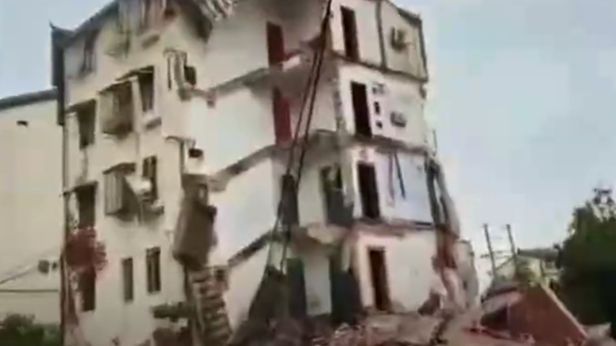 大陆极目新闻报导,居民介绍,事发楼栋高五层,有两个单元,每个单元一层两户。经其到现场查看,垮掉的部分将近有整整一个单元。