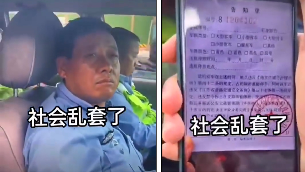 录像市民打开这几人刚刚贴的罚单,上面写着,“到南京市公安局交通大队第八大队处理”,明显是交通警察罚单。