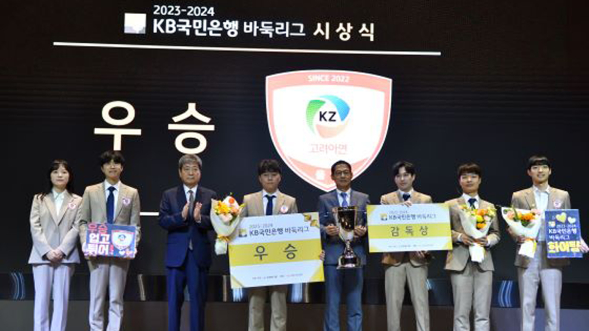 【新!唐!人:北京时间2024年06月20日讯】6月18日,2023-2024赛季韩国围棋联赛颁奖典礼在首尔汝矣岛格莱德(GLAD Yeouido)酒店举行,联赛冠军蔚山队获颁奖杯,队中的文敏钟八段荣膺联赛MVP,外援廖元赫九段斩获新人奖,教练朴承华成为最佳教练。