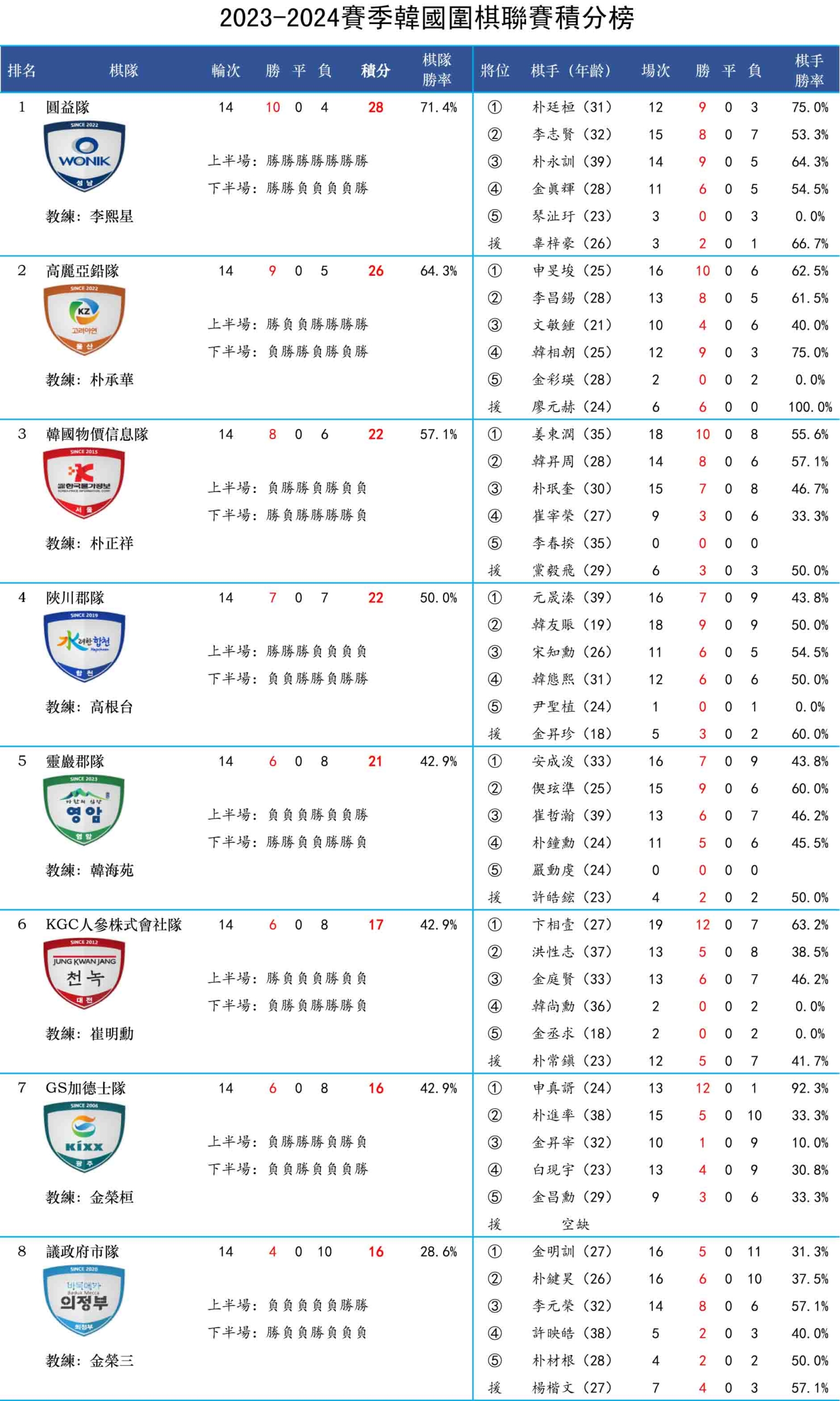 相关阅读:2023-2024赛季 韩国围棋联赛积分榜及赛程赛果