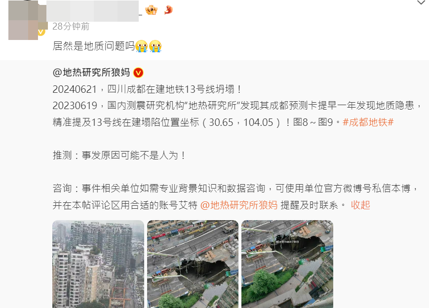 “比薄脆还薄,成都地下是不是被掏空了。据说,早就精确预警塌方的位置有隐患,强行施工导致。”