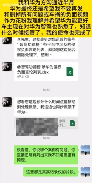 但华为方面仍不愿善罢甘休,开始“上纲上线”,声称他发布的影片内容“涉嫌断章取义,无法保持客观和真实性,影响到中国汽车智慧驾驶的发展”云云,并威胁他如果不接受“友好沟通”的话,华为将向影音平台和网信办“反映”。