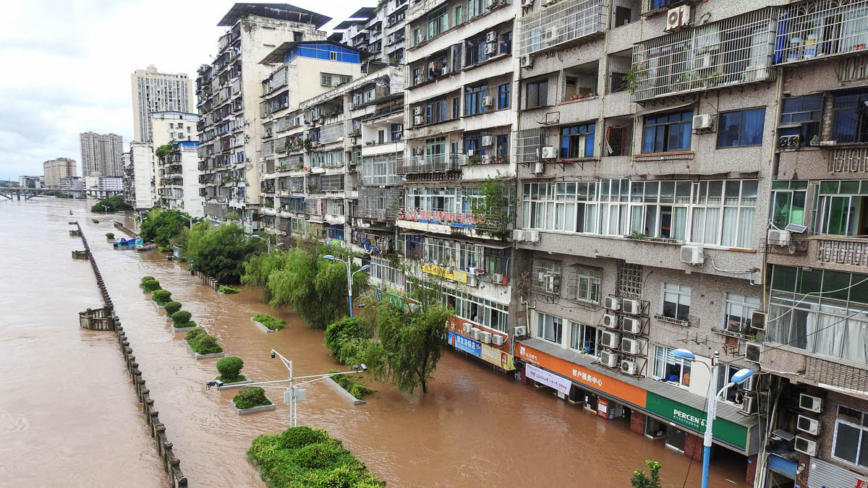 达州渠县民众王先生:“渠江河,水还在涨,水涨得太高了,达州渠县被淹掉了,一楼的门市已经看不见了,二楼这里应该马上进水了,人民市场也被淹掉了,现在心慌的,公司都被淹了,每年都要淹。下午洪峰过境,随时涨水了,想出来都出不来了。”