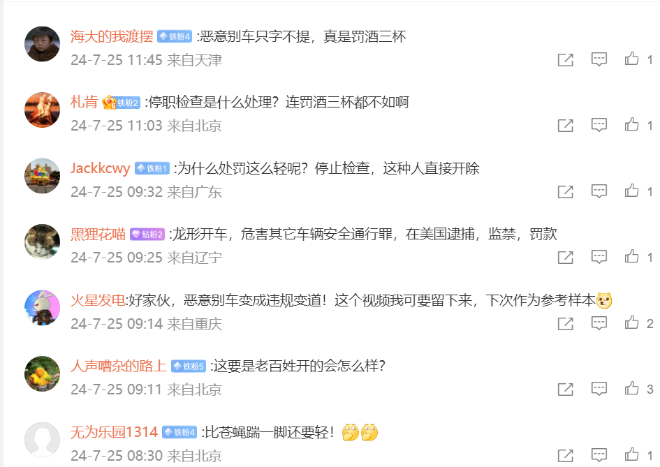 网友评论说,“法院真会说话,这只是个违法变道”、“是违规变道的事吗” 、“将主观恶意别车描述为不打转向灯违规变道”、“停职检查是什么处理?连罚酒三杯都不如啊”、“这要是老百姓开的会怎么样?”“上次湖北高速上交警憋停的事情后面还有后续么?”
