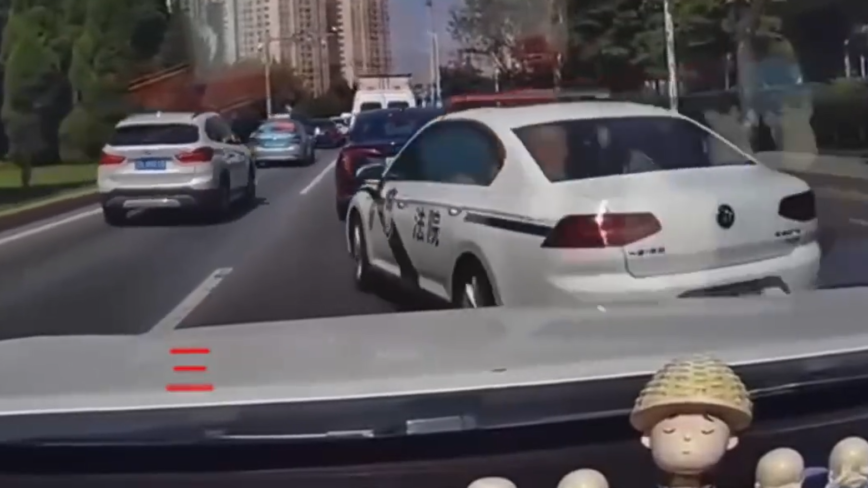 网上流传行车记录仪视频显示,7月18日下午2时26分许,记录仪车辆驾车在中间车道行驶,车身有“法院”字样、悬挂车牌疑为“辽-BA200警”的白色公务车在最右侧车道行驶。记录仪车辆虚线变道至中间车道行驶时,白色公务车突然实线变道强行插队至中间车道,记录仪车辆赶紧减慢车速,停车。