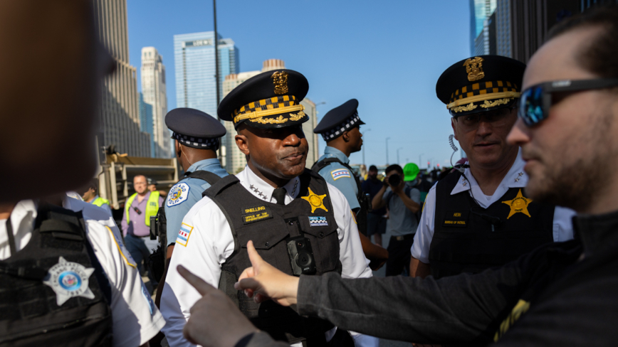 芝加哥警察局长Larry Snelling:“芝加哥警察局会保护城市里的每一个人。 我们会保护人们的权利:他们第一修正案的权利、他们表达的权利。 但我们不能容忍的是恐吓。 我们不会容忍暴力。”