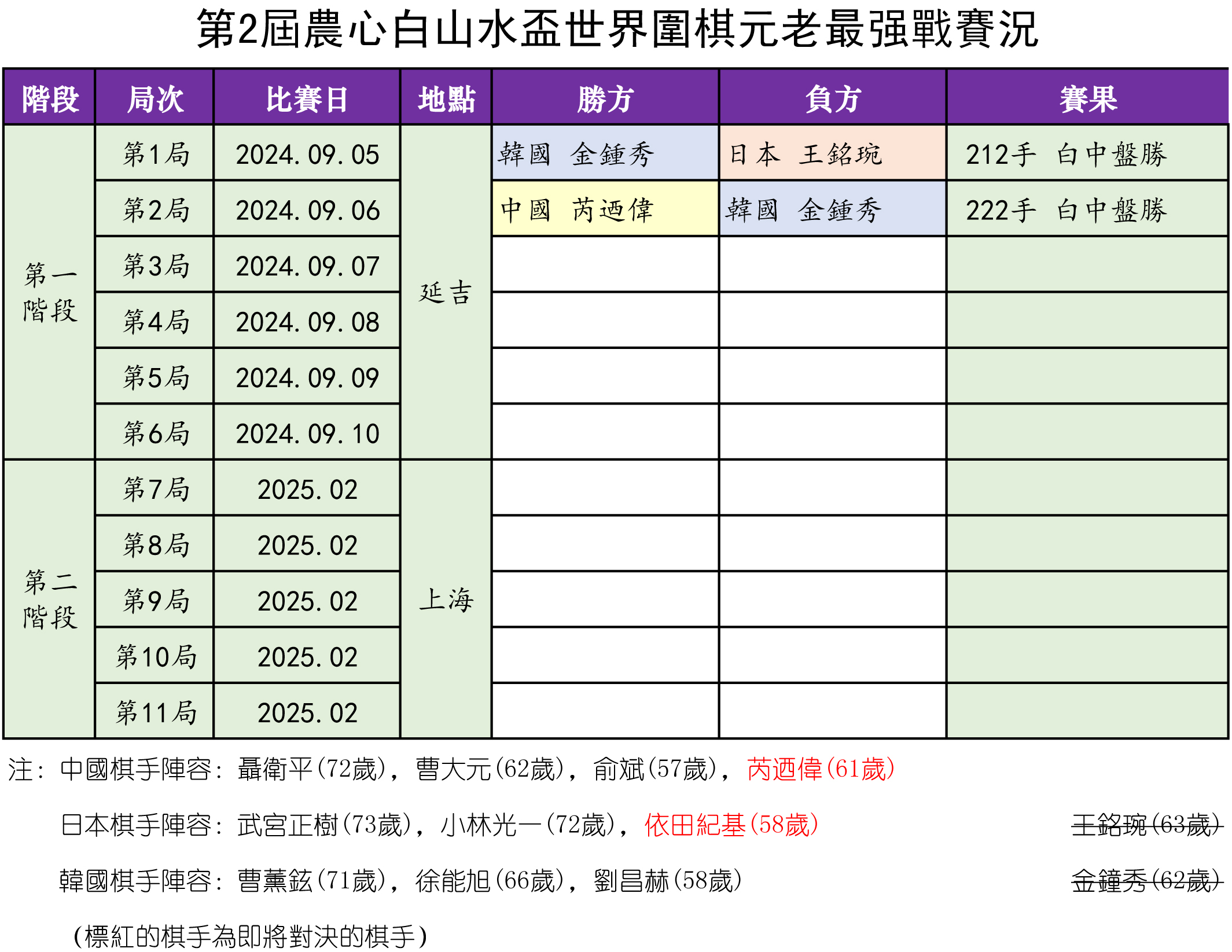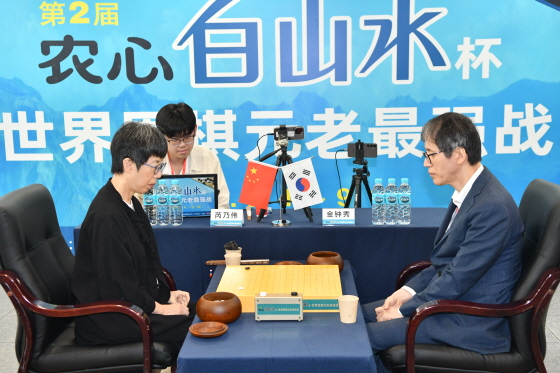 同时举行的第2届“农心白山水杯世界围棋元老最强战”(三国围棋元老擂台赛)也结束了第二场争夺,赛事唯一的一位女棋手、目前仍然活跃在棋坛一线的中国元老芮迺伟不辱使命,击败韩国元老金钟秀九段。明日她将接受日本世界冠军依田纪基的挑战。