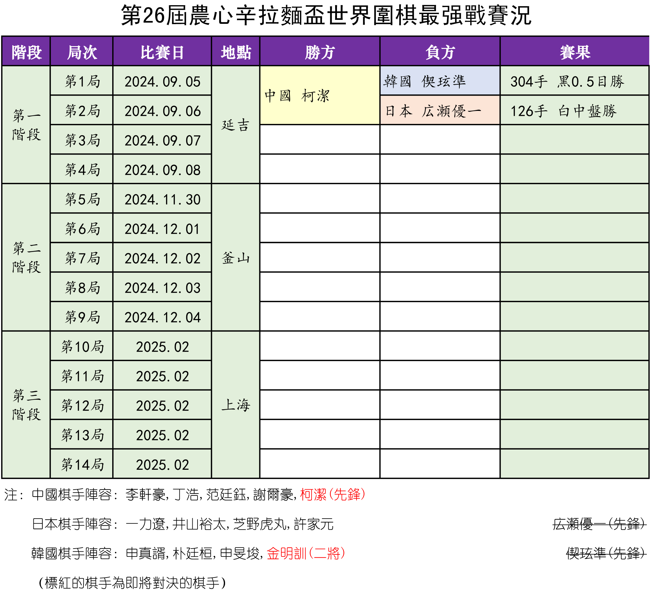 【新!唐!人:北京时间2024年09月06日讯】9月6日,第26届“农心辛拉面杯世界围棋最强战”和第2届“农心白山水杯世界围棋元老最强战”继续在中国吉林延吉展开激战,中国大陆两员战将纷纷奏凯,柯洁九段速胜日本队先锋広瀬优一七段,九年来首次在这项赛事中连下两城;芮迺伟九段完胜韩国元老队的金钟秀九段,坐上擂主宝座。7日,韩国队二将金明训九段和日本元老队的依田纪基九段将登场攻擂。