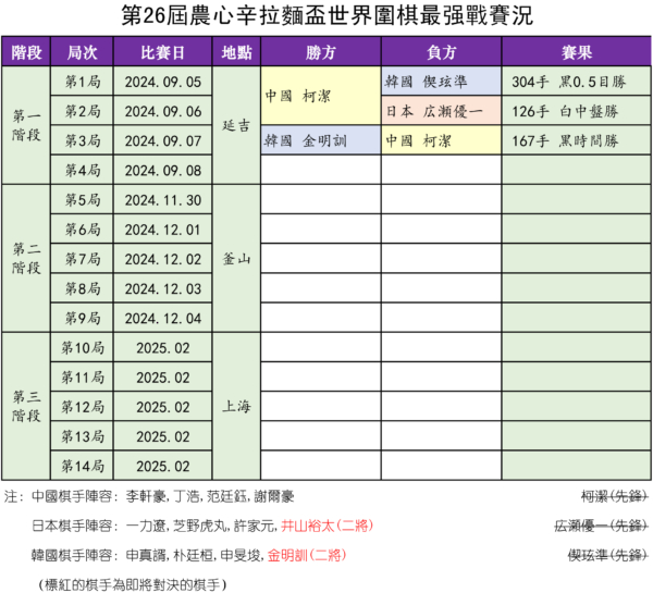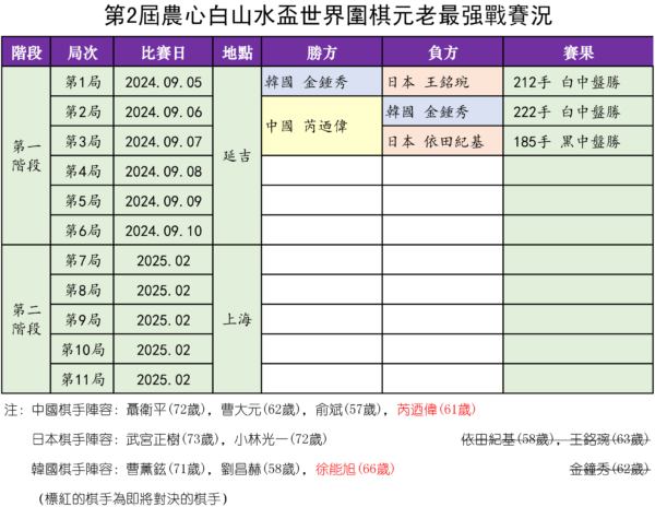 【新!唐!人:北京时间2024年09月07日讯】9月7日,第26届“农心辛拉面杯世界围棋最强战”和第2届“农心白山水杯世界围棋元老最强战”第3局在中国延吉市结束。中国队先锋柯洁九段因超时按钟落败,金明训九段为韩国队迎来首胜。中国元老队芮迺伟九段力擒日本世界冠军依田纪基九段。8日,日本队二将井山裕太九段和韩国元老徐能旭九段将登场攻擂。