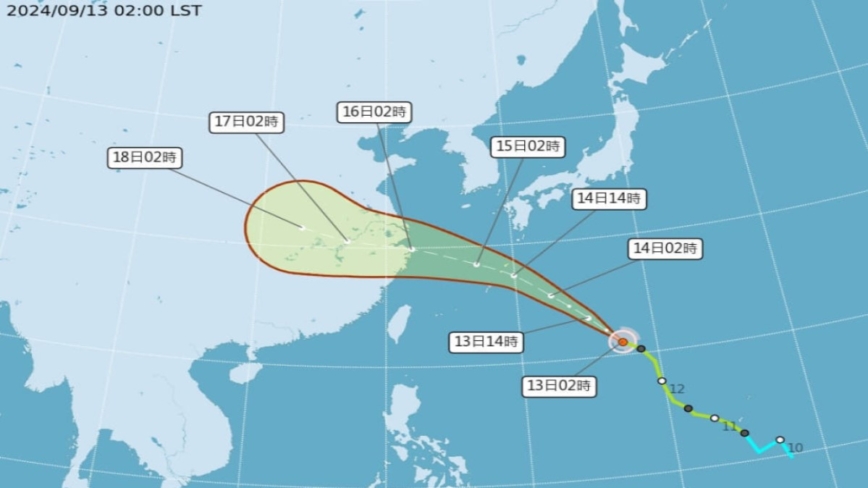 气象署预报员 李孟轩:“预估它未来的路径先是往西北方向移动,那大概在明天14号左右,会逐渐通过在琉球附近的海域,接着比较偏西北西的一个走向,大概是在16号,就是周一的时候,就会登陆到中国上海这一带。”