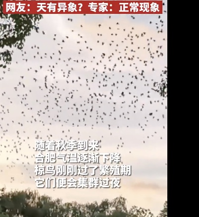 有微博网友发帖说,“昨天合肥出现两个现象,一个是疑似地震云,另一个是合肥上空现大量飞鸟。许多网友看后都担心是不是天有异象或者预示着再次地震?对此,记者请教了相关专家,专家表示,这是一种正常的椋鸟集群自然现象,市民不必恐慌。这······”