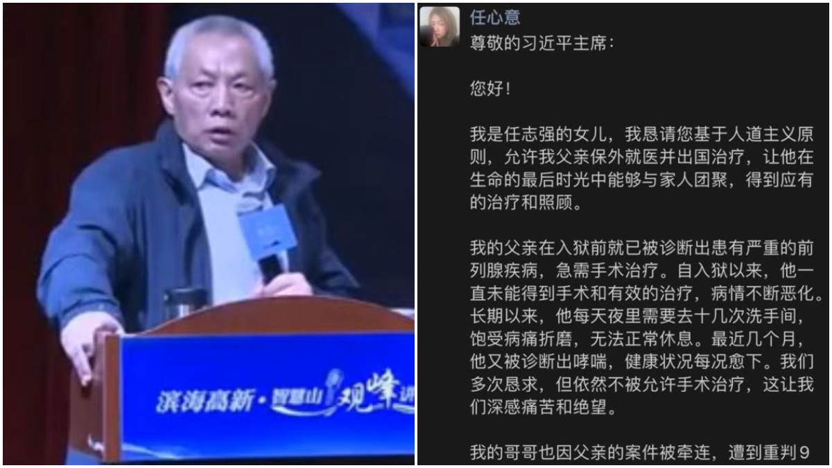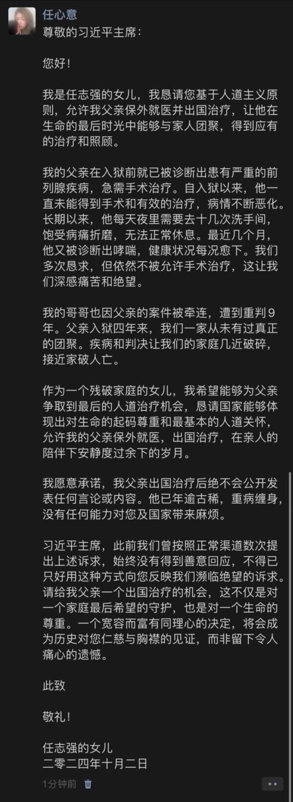 10月3日,海外社交平台传出一份署名“任志强的女儿任心意”的公开信,内容是请求习*近*平允许父亲保外就医,出国治疗。