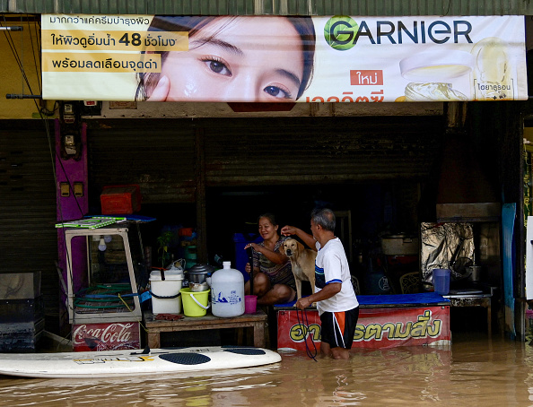 在清迈(Chiangmai)市中心,夜市的民众涉过褐色的洪水,中央火车站也被水淹,目前已经关闭。