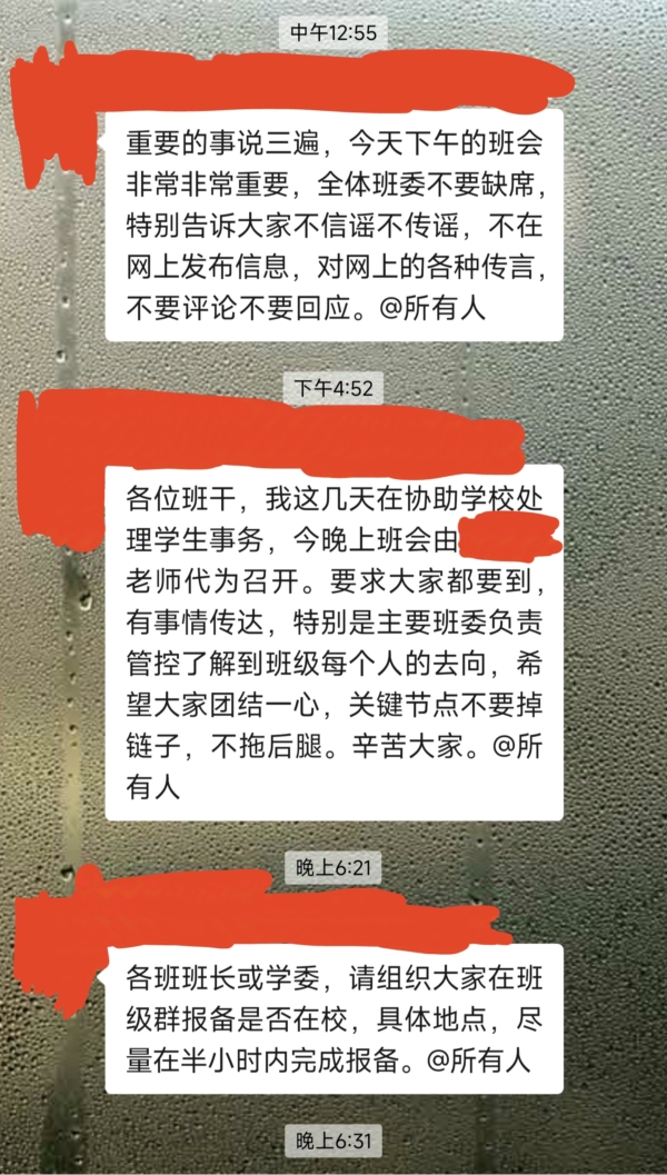 同校学生分享校内通知,显示校方连夜封杀消息,要求班干部迅速掌握每个学生的去向,并威胁学生不准在网上透露消息。