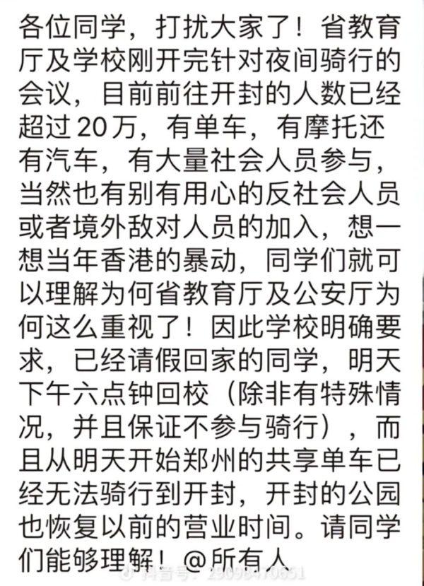 据海外X平台上传出一份河南某高校的内部通知显示,据官方消息,夜骑到开封的人数已超过20万, 有单车、摩托车和汽车,还有大量社会人员参与,也有“别有用心的反社会人员和境外敌对人员”加入,云云。
