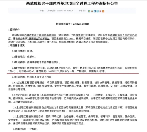大陆财新网11月19日对此进行报导,该项目名为“西藏成都老干部休养基地”,当前启动的是勘察和设计工作招标,招标人成都城投集团是一家专门开发建设政府类重大市政工程的大型国企。