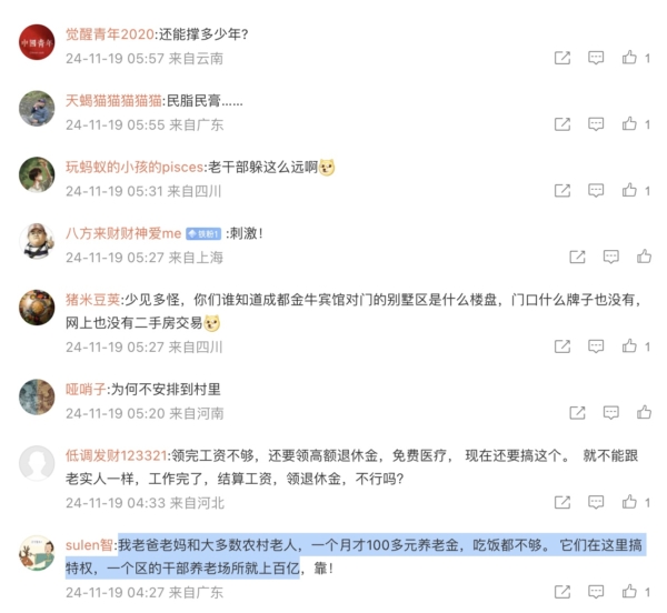 网友纷纷留言批评:“一边领着上万的退休金,一边还要疗养,挂了以后还有比老百姓多好几倍的抚恤金,真是天上人间了”“有高额养老金还不够,你让领低保的人乍活啊?”“我老爸老妈和大多数农村老人,一个月才100多元养老金,吃饭都不够。 它们在这里搞特权,一个区的干部养老场所就上百亿”。