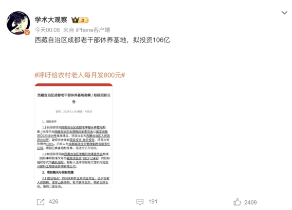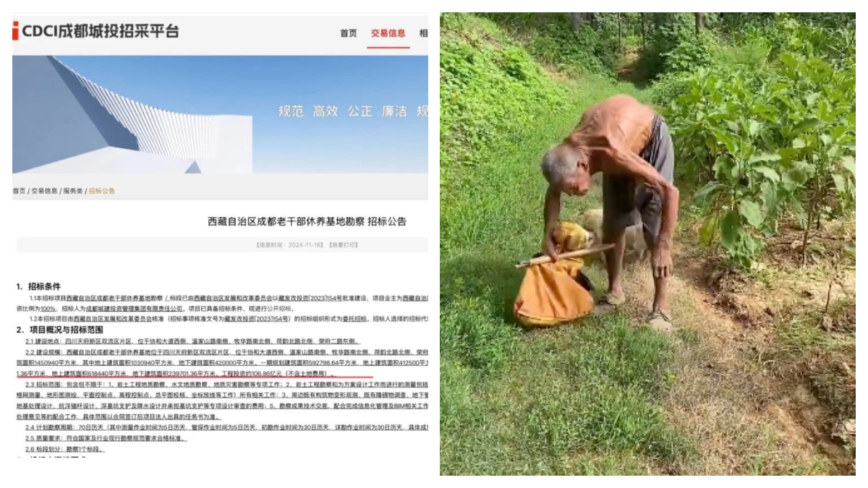 【新!唐!人:北京时间2024年11月20日讯】近日,四川省一则招标公告透露,在成都修建西藏老干部休养基地,工程耗资一百多亿元,与农民养老金不足120元形成鲜明对比,引发舆论哗然。有人呼吁:“请给农民工养老金涨到每月800元”。