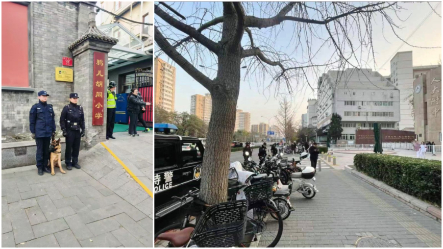 【新!唐!人:北京时间2024年11月20日讯】大陆学校随机伤人事件频发。网传北京不止一所中小学门口有公安看守,被指权贵子弟云集的人大附中门口还有特警车驻守。