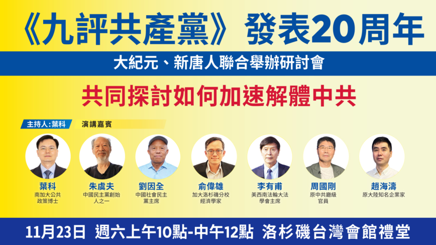《·九·评*》发表20周年是一个重要里程碑,大.纪.元;和新!唐!人:将在各地举办系列研讨会。继纽约法拉盛成功举办《·九·评*》20周年研讨会之后,11月23日(周六)上午10点至12点,洛杉矶大.纪.元;报社和新!唐!人:电视台将在洛杉矶台湾会馆礼堂举办纪念《·九·评*》20周年研讨会,邀请经济学家、原大陆企业家、原中共体制内官员,知名民主活动家等专家学者共同研讨《·九·评*》内容及其对中国和世界的影响,以及未来如何推动更多中国人认清中共、退出中共。