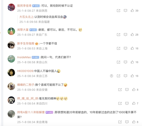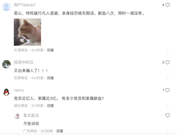还有网友分享自己的经历,说,“我献过几次,真的白搭!妈用血不给报销,爸说是要用血,问了,也白搭”“别信,不要献血,我就是最好的例子,我年轻时候献血。前后献了800毫升。说直系亲属都可以免费用血,当我母亲急需用血时,却说没有血,要我们自己再买血,而且花高价买”; “感同身受,我大学献血400,我妈平时献血1200,到后来我爸做手术,愣是查不到献血信息,到最后我们花了好多钱买的,…献血证没有信息”“恶心,特权盛行凡人退避,亲身经历绝无假话。献血八次,用时一滴没有”。
