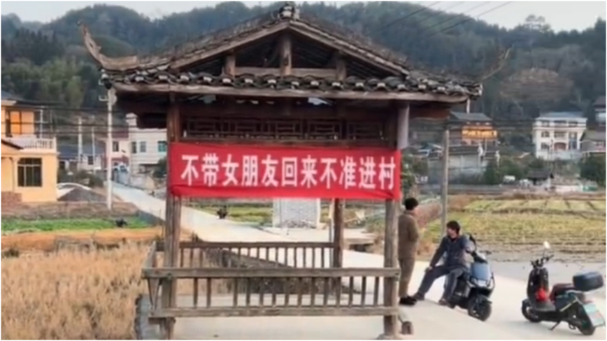 网络上传的视频显示,村里的一凉亭上挂着一条写着上述标语的横幅,有两位年轻人在亭子旁闲聊。发布者配文表示,“村长说了,不管你今年开奔驰、宝马还是奥迪,不带女朋友回来不准进村。”