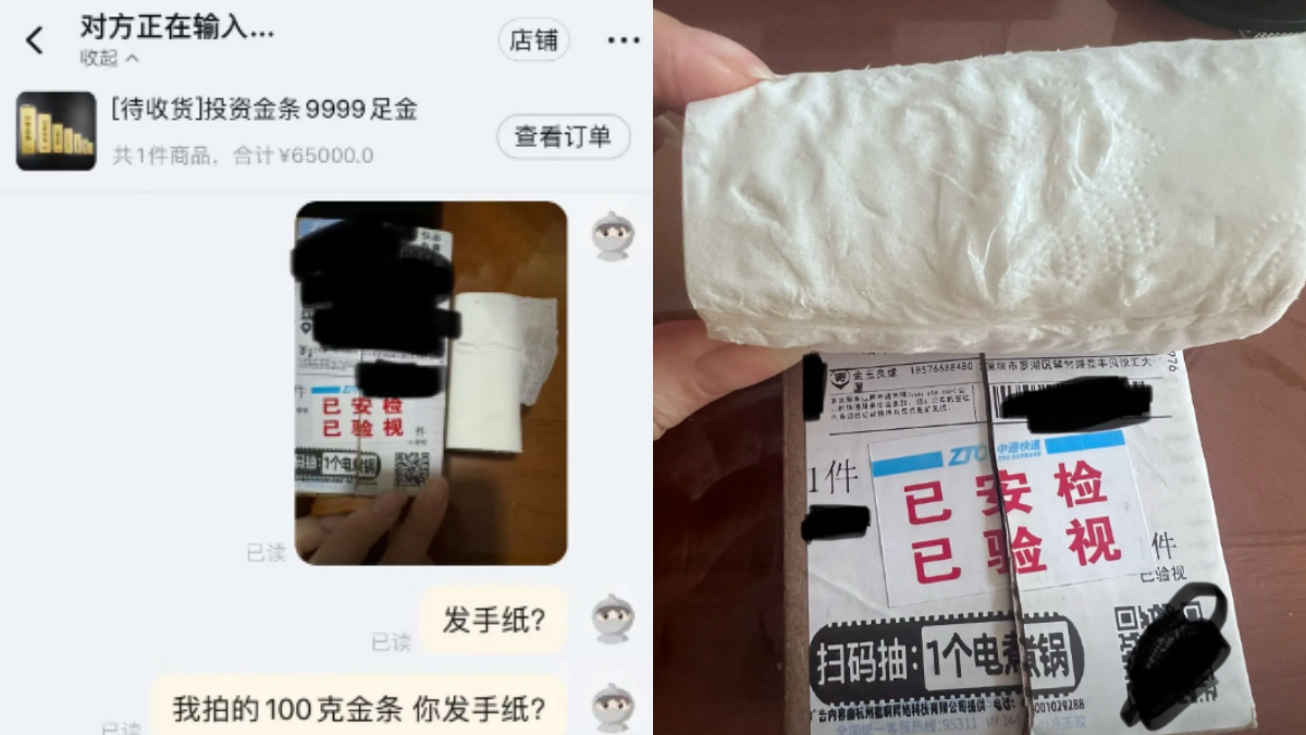 【新!唐!人:北京时间2025年02月20日讯】今年过年期间,黑龙江哈尔滨盛女士在某购物平台花了6.5万元(人民币,下同)购买了100克金条,收到后发现竟是一卷手纸,让她傻眼。