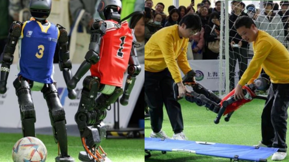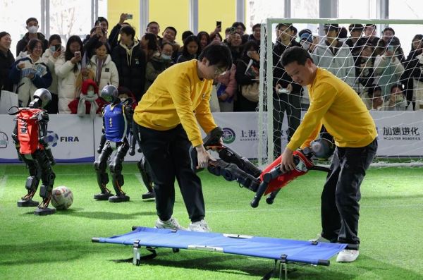 【新!唐!人:北京时间2025年02月23日讯】日前在上海举行的全球开发者先锋大会(GDC)上,主办方安排的一场人形机器人“足球赛”吸引了众多参观者的眼球。一个机器人“球员”在比赛中突倒地被人抬下场,意外成为了众网友围观调侃的焦点。
