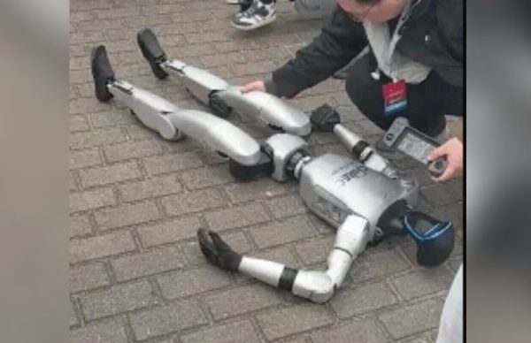 与此同时,中国网络社群中还传出另一段视频,显示一个疑似宇树科技Unitree G1的人形机器人在未知的场合倒地后,一名工作人员蹲在这台机器人旁边,一边检查机器人的腿和胳膊的状态,一边手持操纵板反复调整,但这个机器人始终没有任何反应。