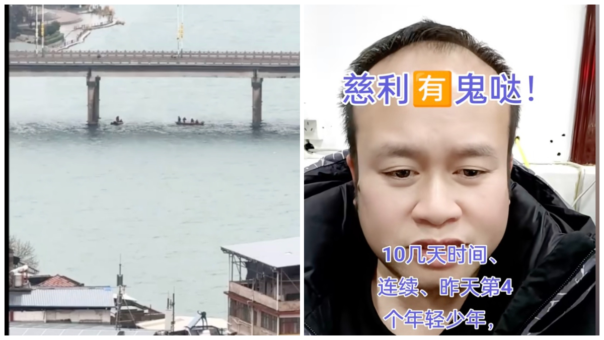 网传视频中,在两座高层楼之间,远远可以看到长江和远近两座大桥,桥下有两条小船在打捞着什么,岸边还有很多民众在观看,录制视频的女士说,“从上个月和这个月,已经跳了4个小孩了,今天又跳一个。”“只有14岁,读初二。”“这些打捞人员也很辛苦。”