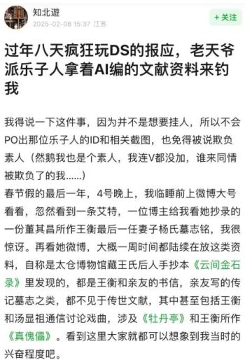 第三个例子是有人利用 DeepSeek 生成的虚构历史材料,对历史博主“知北游”设局,而后者也险些“上钩”。但这些AI生成的资料中搞错了两个历史人物的死亡顺序,让 “知北游”对设局者提供的“新史料”产生了怀疑,最终经过多日的艰苦查证而得以证伪。