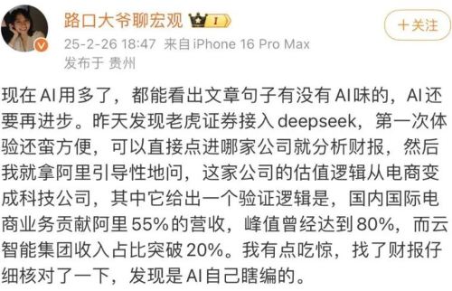 还有网友在试用DeepSeek时发现,这款AI工具竟然自行瞎编了阿里的业绩数据。