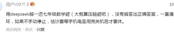 有江苏网友分析说:“DEEPSEEK的数据来源是互联网和自媒体的胡乱整合,在对原数据没有辨别力,还加上自创的推理,错误和虚假百出。”有上海网友跟帖道:“而且一样的问题,换个手机问,回的答案不一样。”
