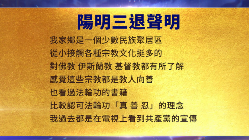 阳明说:我家乡是一个少数民族聚居区,从小接触各种宗教文化挺多的,对佛教、伊斯兰教、基督教都有所了解。感觉这些宗教都是教人向善。也看过法轮功的书籍,比较认可法轮功“真、善、忍”的理念。 我过去都是在电视上看到共产党的宣传,到底共产党是咋回事,一点也不了解。不过前些年老家强拆征地,连哄带骗地拆了我们家房子,到现在也不给新房,开发商卷钱跑路了,房子也盖不出来。农村也是如此,强征了农民土地,也不给补偿款,还雇用黑社会打架,报警公安局也不管。从这件事情上我看透了共产党官商勾结、欺压百姓的真面目。我看在眼里,记在心上。声明退出加入过的共青团和少先队。 我觉得百姓们应该觉醒,团结起来消灭这个恶魔党,保住自己的财产和尊严,更好地生活下去。