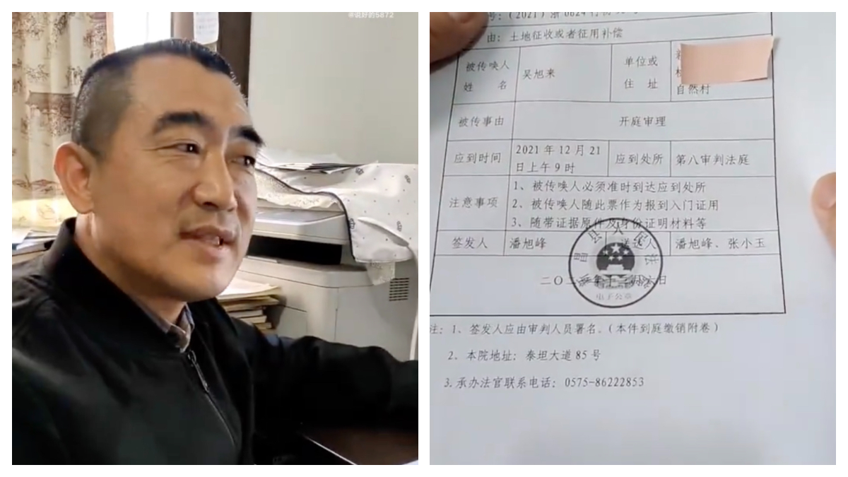 3月5日,大陆微博上流传一段视频,视频发布者“梁涛”自称曾起诉新昌公安,他展示了几份司法文书,称是“新昌法院的传票”。传票显示,该文件是一份开庭传票,要求当事人于2021年12月21日上午9时到新昌法院第八审判庭开庭。另一份文件是判决书,显示,判决时间是2021年12月20日,日期上盖章是新昌法院的红色印章,审判长为潘旭峰。