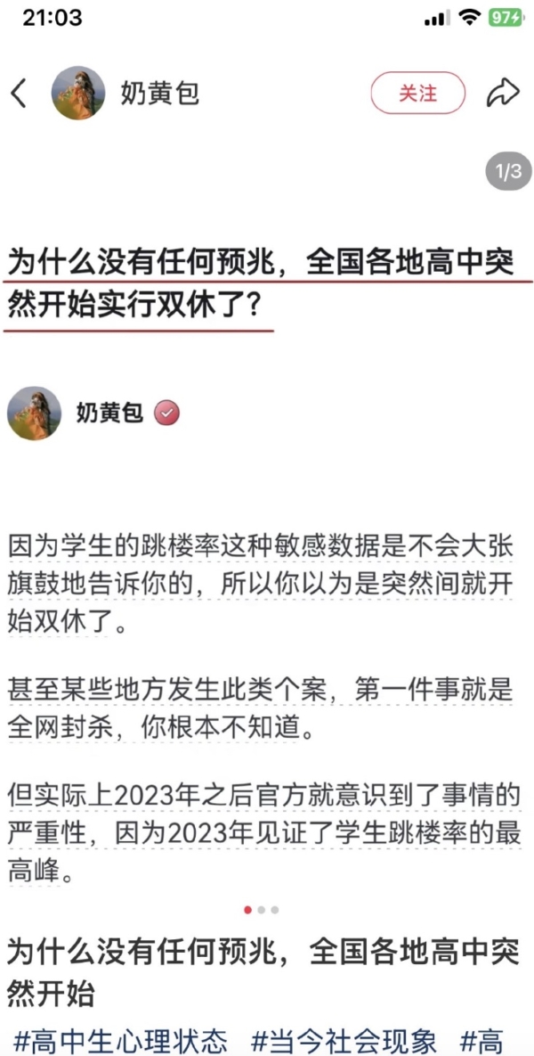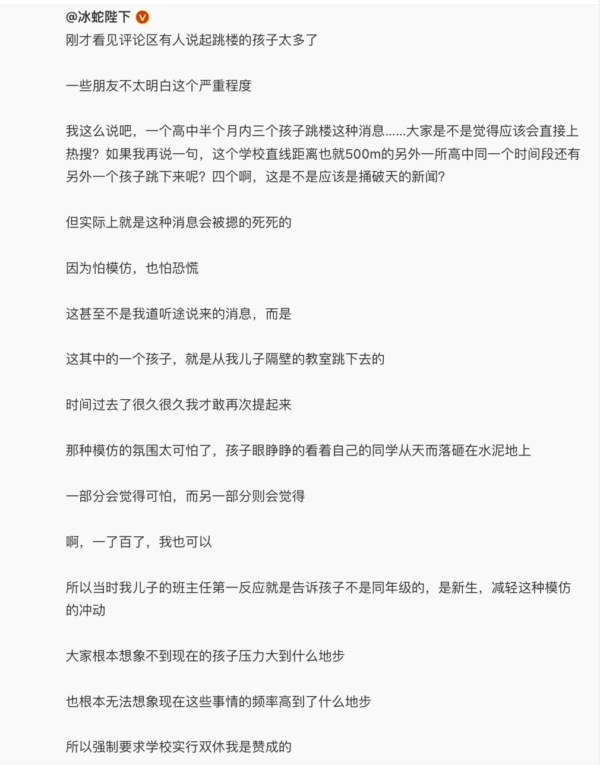 该博主的贴文说,“一个高中半个月内三个孩子跳楼这种消息······大家是不是觉得应该会直接上热搜?如果我再说一句,这个学校直线距离也就500m的另外一所高中同一个时间段还有另外一个孩子跳下来呢?但实际上就是这种消息会被摁得死死的,因为怕模仿,也怕恐慌。”