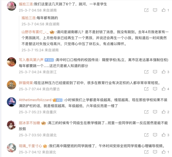 一湖南网友说,“我们这里这几天跳了6个了,跳河,一半是学生。”
