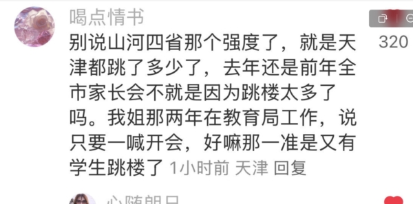 网名为“奶黄包”的网友就此评论,“因为学生的跳楼率这种敏感数据是不会大张旗鼓告诉你的。”“甚至某些地方发生此类案件,第一件事就是全网封杀。”