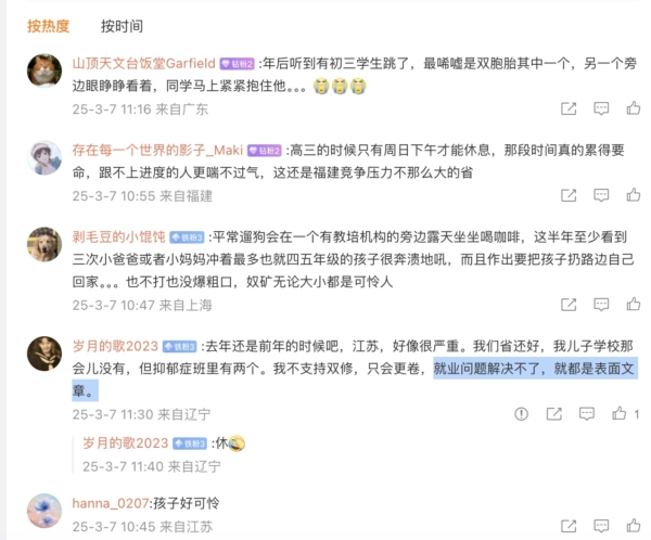还有网友说,高考的压力和就业难有关,“就业问题解决不了,就都是表面文章”。