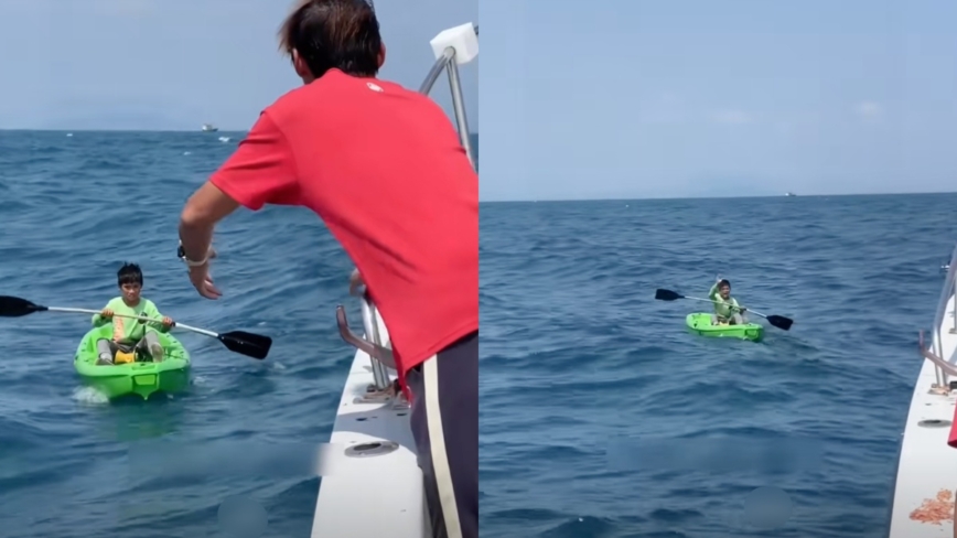 网传视频显示,在三亚附近的海上,一个小男孩独自划着名小船正试图靠近一艘游船,船上有人告诉他慢慢来。