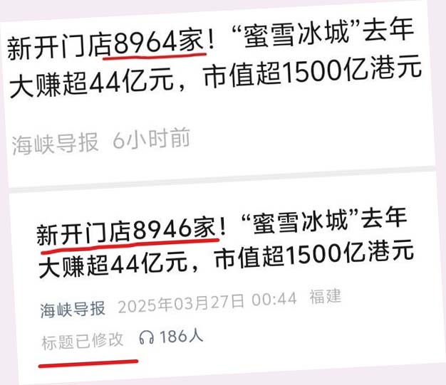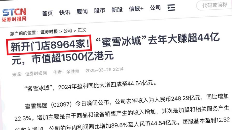 3月26日,《证券时报》官网报导茶饮巨头“蜜雪冰城”2024年的业绩,大标题以“新开门店8964家!”开头,引发网民关注。《证券时报》由党媒人民日报社主管,也是中共证监会、银保监会指定披露信息的报刊。