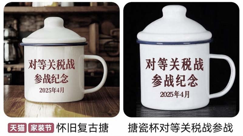 近一周以来,许多大陆商家看到商机,在电商平台拼多多、淘宝及短影音平台抖音贩售多款印有“对等关税战参战纪念”字样的白色搪瓷杯,颇受欢迎。