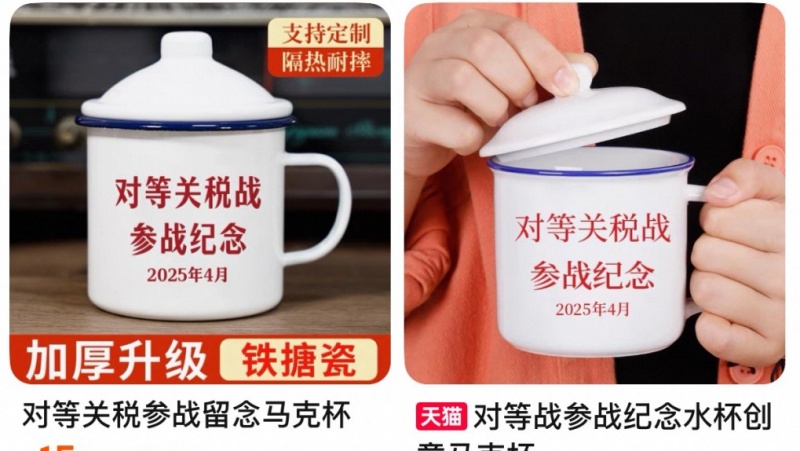 据《星岛日报》报导,记者在4月10日12时许搜索发现,淘宝和拼多多有大量商家销售印有“对等关税战参战”字样的中国老式搪瓷杯,售价多在10元至26元(人民币‧下同)之间。