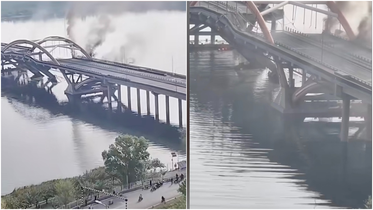 网传视频显示,潮白河大桥多处冒着浓浓的黑烟,大桥中部桥面突然发生断裂,桥体落入河中,桥面几乎断成两段。有网友表示,“早五点多塌了,火是桥边管道里的东西着了。我离八百米在钓鱼。”