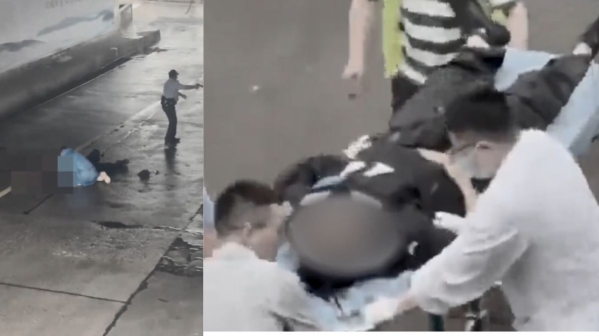 4月22日下午,大陆社交平台流传多条视频,临海市泉井洋路附近发生枪击案,一名警察倒地不起,身旁有大片血渍,另一名警察在旁持枪戒备,有人大喊:“救护车!”